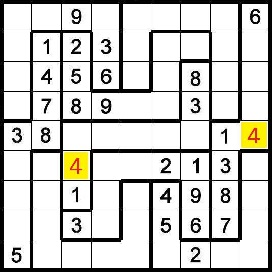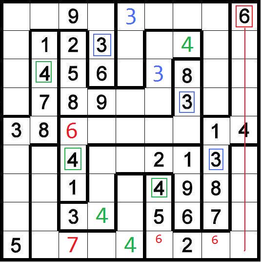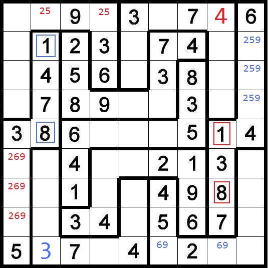 Next, 2 similar places are shown. Red are the variants marked in the leftmost figure "269". From there, the numbers "2" and "5" must be in either square of the U-shaped figure in the upper left corner (the small red numbers shown in the figure). The remaining 3 numbers in the first row are 1, 4 and 8. The box in the 8th column can only contain 4 of these numbers. Blue is an analogous situation on the right side, resulting in R9C2 in square number "3".
