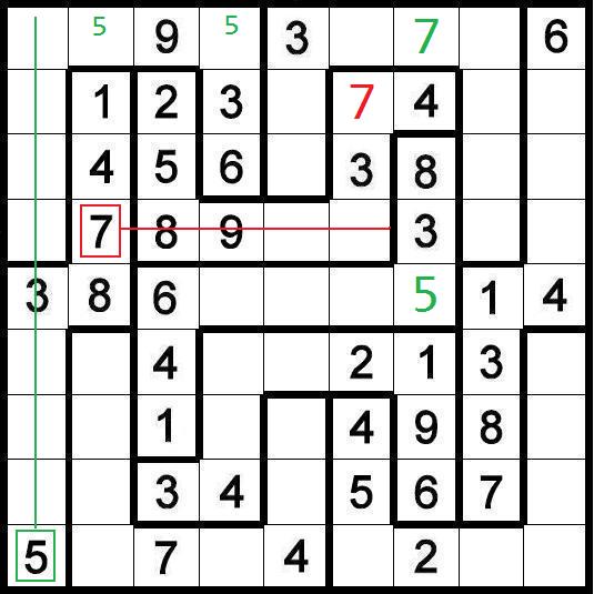 A very simple "7" is shown in Red . The 5 inside the Green box excludes the 5 in the topmost box in the 7th column. So only 7 can go in that box, and the "5" goes R5C7.