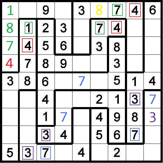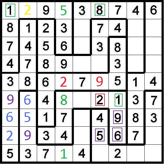 Next, some easier moves. It is advisable to follow the order of colors Red can be used to fill in the middle shape 2 and 9 Green shows how to fill in the 4th column. Yellow can be used to fill in the number 2, as it is the only empty square in this shape. Purple shows in the lower right corner how to fill in the number 9 R8C2 and then R6C1. Blue shows how to fill in column 1 and then column 2.