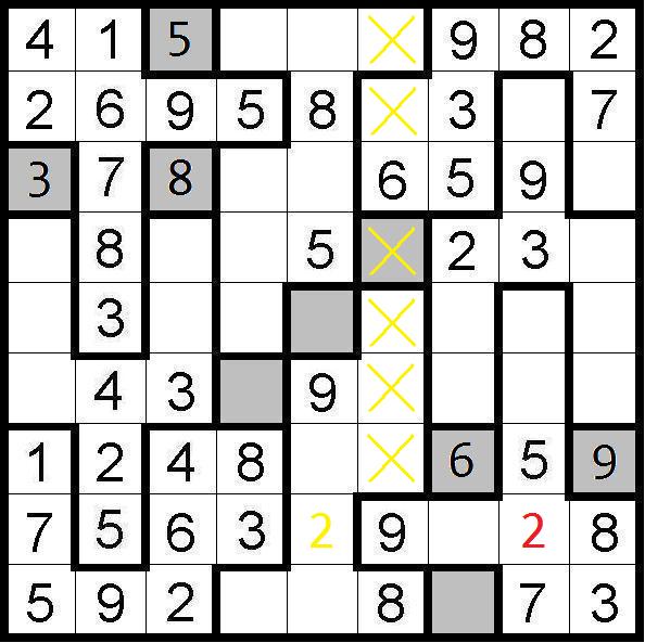 If I were to write the number "2" in the yellow location, then in the 6th column it would not be possible to write the number 2 anywhere. Consequently, the number "2" cannot be R8C5. Therefore, the number "2" is located in the 8th row, in the 8th square (R8C8).