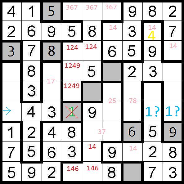 Next, a slightly more complicated trick. So it's worth carefully reviewing why I've written something somewhere. 1. First, I've written some variants in pink in different boxes. "14" is in places where there are 2 empty squares in a row or column or area and the only missing numbers are 1 and 4. (I hope it's understandable). In the middle of the two squares, I've written 2 numbers in pink in places where it is known that these numbers are in these two squares - but it is not known which number is in which. All that is known is that no other number can be there. 2. Then, in darker red, I've marked all the possible numbers that can be written in them in important places. It turns out that the variants in the two areas are in two different columns and have so much in common that there must be at least no. 1 somewhere in both areas. 3. As a result, it can be stated that the gray square shown with green text cannot contain the number "1", because otherwise it is not possible to fill the areas shown with dark red text with numbers "1". 4. In the second picture, the blue arrow shows line no. 6, and this line also shows all the possible places where it is possible to write the number "1". It turns out that there are only 2 possible places for this. 5. No matter which square I write this 1 in, in both cases the number "1" cannot be in square R2C8. Consequently, the number "4" is in this square (shown with yellow).