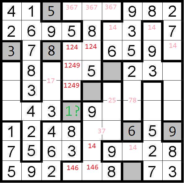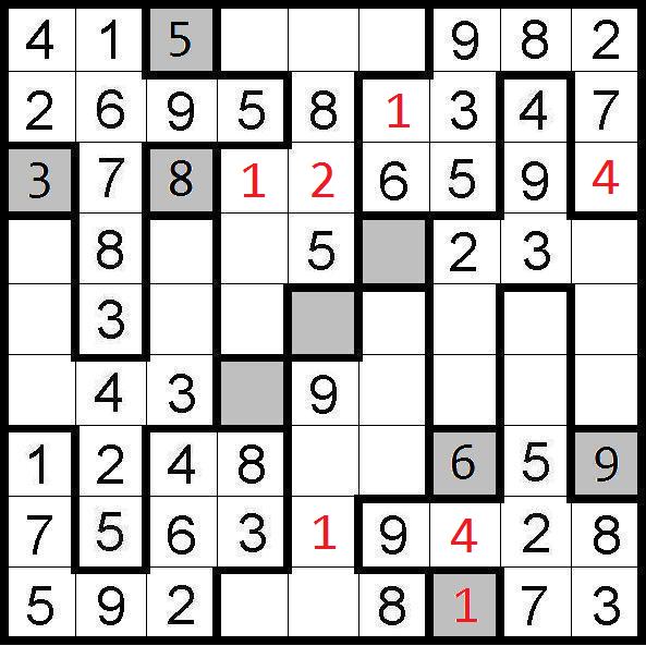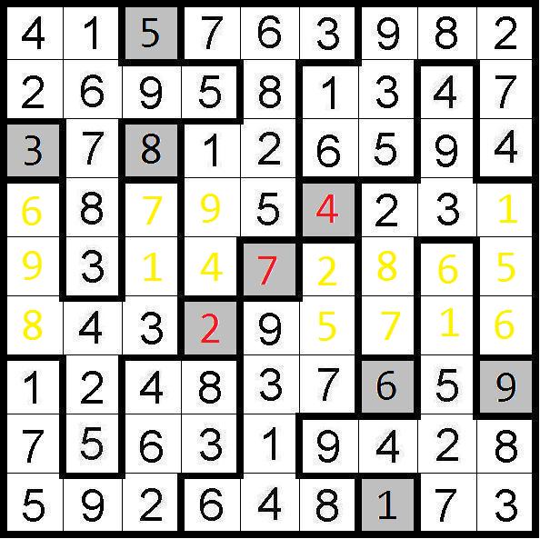 Then it is known that the missing numbers "2", "4" and "7" are in the grey squares. These can now be neatly placed (shown in red). And then the sudoku is easily solvable.