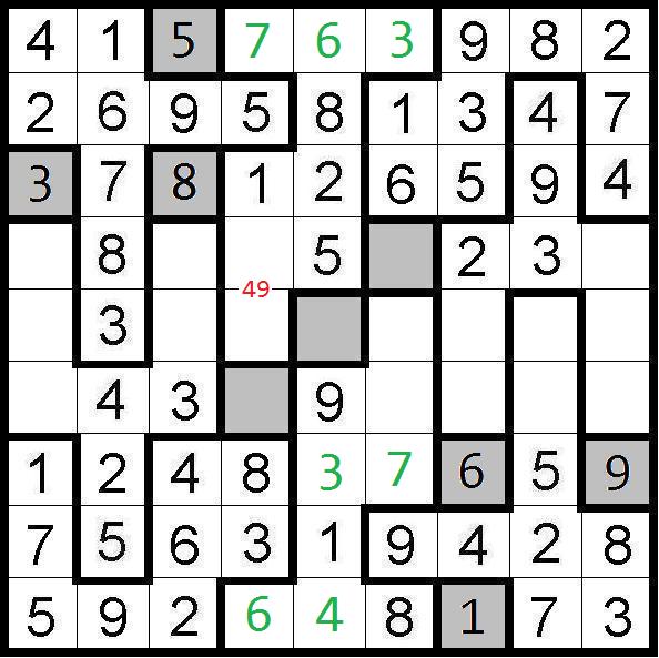 Next, the "49" is marked in red, where it is known that they are located, but it is not known which one is in which square. Then it is possible to find the numbers in the 9th row. Then in the 1st row and then in the 7th row. The numbers are shown in green.