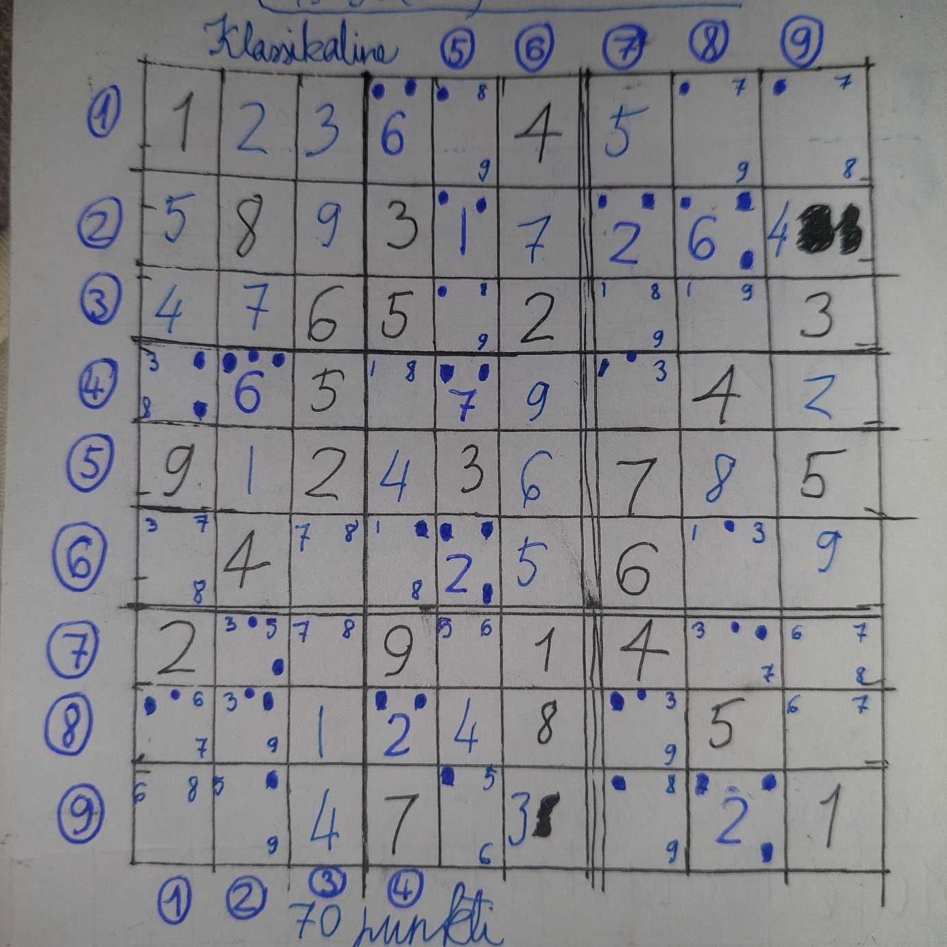Once again, 9 out of 29 sudokus were left unfinished, unsolved or with errors, but 7 out of 8 from the 1st round I have later solved with either minor or major difficulties. Unfortunately, the unfinished one from the 2nd round, or sprint, was lost because I forgot the competition location on my sprint sheet. But there remains 1 classic sudoku, or 70-point, which I can't seem to solve. I have tried different methods, but to no avail. There are quite a few squares with only 2 options, so I could solve it using 50-50 (by experimenting), but I assume that it will still be solved logically, and let's be honest, solving it with 50-50 is still not right. So I'll add a picture of this sudoku, maybe some pro can help me?